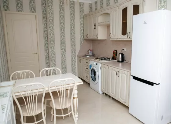 Кухня, газ-плита, холодильник, электр-чайник, кастрюли, кухонная посуда.